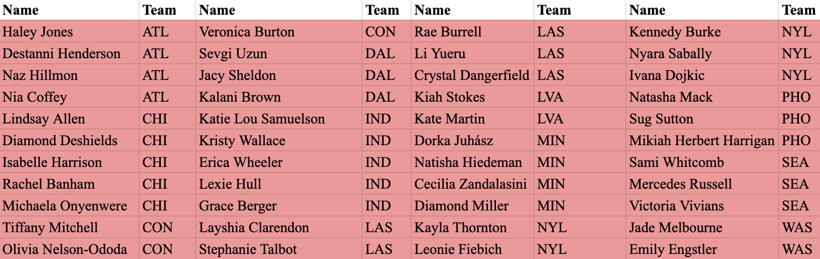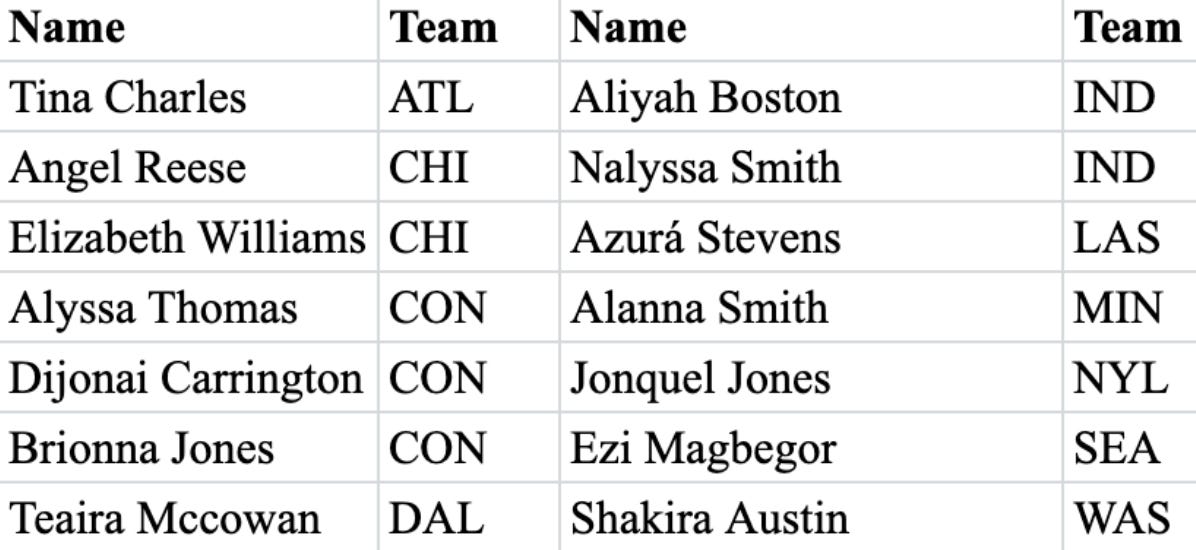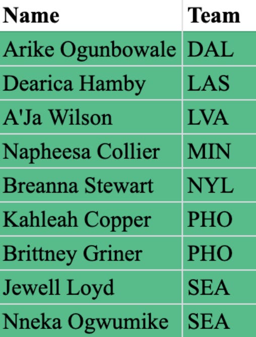 Upon inspection, the Dallas Wings roster seems way more talented than their record shows. Why might this be? Injuries. Injuries have riddled the Wings’ lineup, and investigating per-game statistics doesn’t truly capture that. I believe that if the Wings team can maintain good health for the remainder of the season, they will move up drastically in the standings. Although I’m not sure if they could catch Chicago or Indiana for the 8th spot in the playoffs, betting against Arike Ogunbowale is never a good idea (just ask the Team USA selection committee).