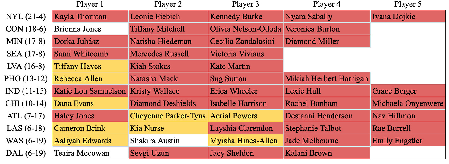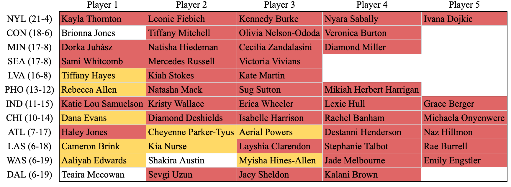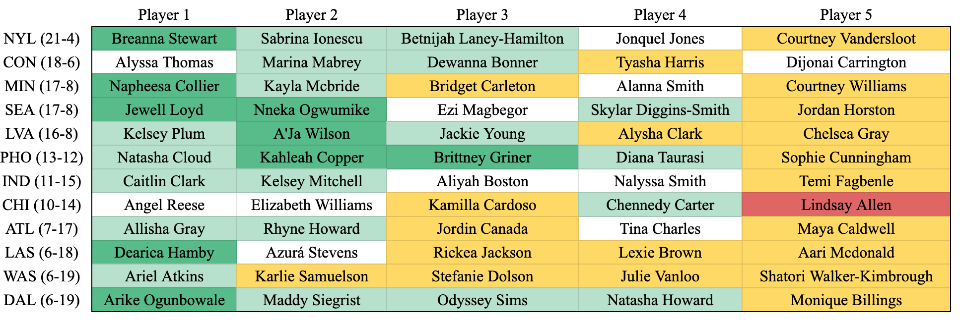 When looking at all of the winning teams (PHO and up), an interesting finding emerges. All of those teams but one only include one player from their four or lower in their starting five. The only team that doesn’t? The Las Vegas Aces and Chelsea Gray. If you were to place Chelsea Gray into tier two (which I would argue is the correct place if she wasn’t injured to start the year) all of the teams with a winning record have only one tier four player in their top five minutes per game. In addition to this, only two teams with losing records can match that quality.