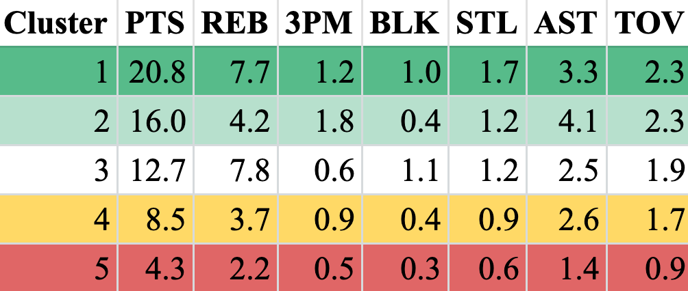This cluster averages 7.8 rebounds per game and 1.1 blocks per game, both the most of any group. They also average 0.6 3-pointers made per game, which is the worst of the ‘starter’ groups. This reinforces the idea that this cluster is primarily made up of ‘bigs’.