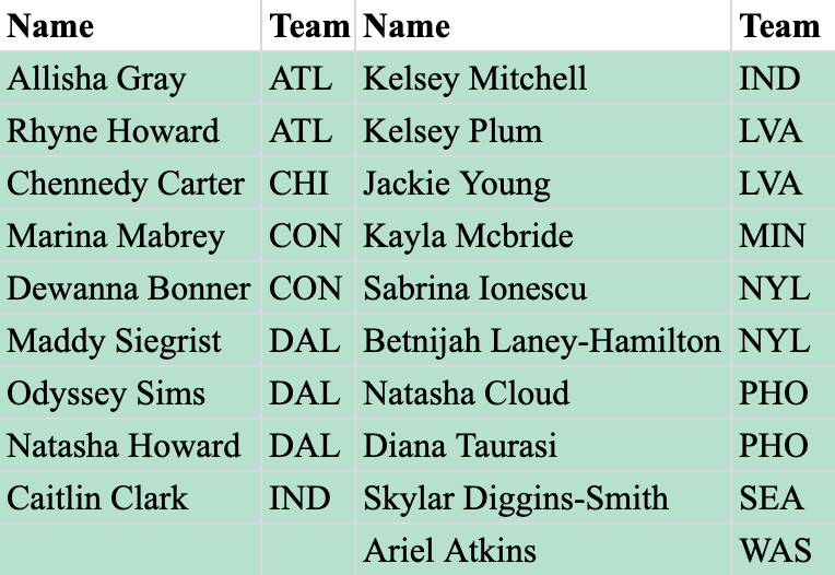 Although A’ja Wilson is the clear-cut MVP frontrunner at the start of this season, it’s hard to argue any of the other athletes don’t deserve to be represented in this group. This cluster accounts for 6 of the 12 women selected for this year’s Olympic team and recent All-Star MVP Arike Ogunbowale. These players are undoubtedly top-tier.